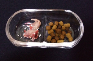 基本のご飯セット。水とドライフードを水に浸してゴートミルク+したものとおやつ的な虫など。